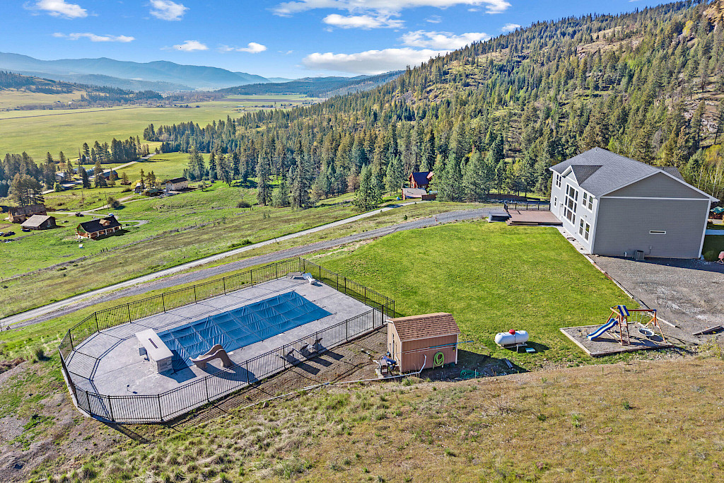 Discover breathtaking views & modern elegance in this stunning 4-bedroom, 3-bath home situated on over 6 acres overlooking the Colville Valley. Sunlight floods through expansive picture windows, highlighting the kitchen w/concrete counters, gas range & walk in pantry, dining area & vaulted living room. The main floor boasts a spacious primary suite w/a luxurious tiled walk-in dual head shower, double sinks & closet w/laundry facilities conveniently located nearby. Upstairs, you'll find three bedrooms, loft area, den/office & full bath. The spacious unfinished basement is insulated & wired w/garage access. There is also a heated saltwater pool w/gas open flame firepit, hot tub, deck & large lawn.